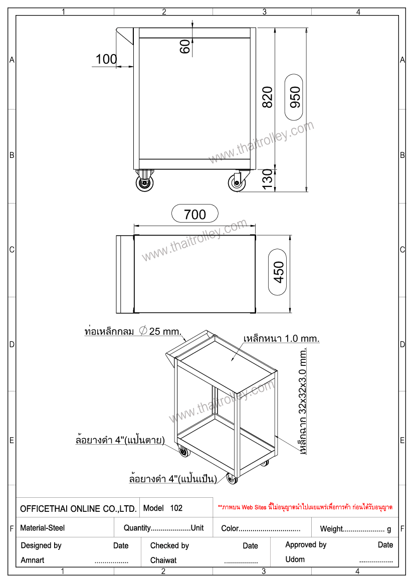 | รถเข็นเครื่องมือช่าง และอุปกรณ์ทั่วไป ชนิดทำด้วยเหล็กพ่นสี ขนาด 45 x 70 x 95 C.M. ขอบกันตกแต่ละชั้น สูง 6 C.M. แบบ 2 ชั้น ชนิดทำด้วยเหล็กพ่นสี ล้อยาง ขนาด 4 นิ้ว รับน้ำหนักได้ 250 ก.ก. แข็งแรง ทนทานใช้งานสะดวก ประกอบโครงรถ ด้วยงานเชื่อมติดกันทั้งคัน เหล็กพ่นสีมีให้เลือก 5 สี พ่นด้วยสีฝุ่น (Power Coating) อบด้วยอุณหภูมิ 180 องศาเซลเซียส |