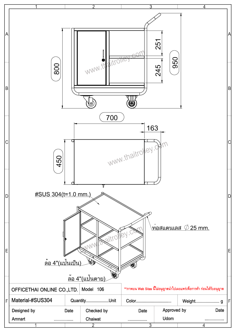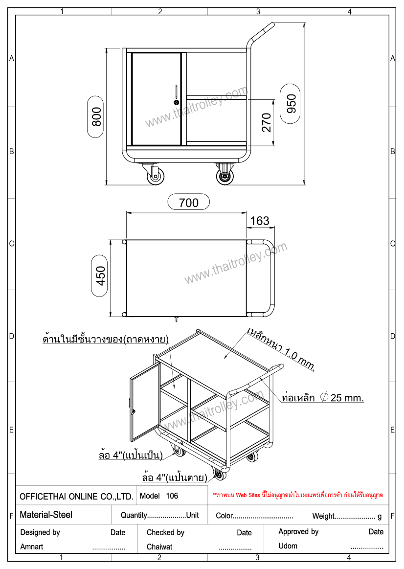 รถเข็นเครื่องมือ ขนาด 70 x 45 x 90 C.M. แบบ 3 ชั้น พร้อมตู้เก็บเครื่องมือ ถาดทุกชั้นพับขึ้นรูปอย่างแข็งแรง ขอบกันตก 2.5 C.M. เชื่อประกอบติดกันทั้งคัน ขนาดล้อ 4 นิ้ว รับน้ำหนักได้ 250 ก.ก.