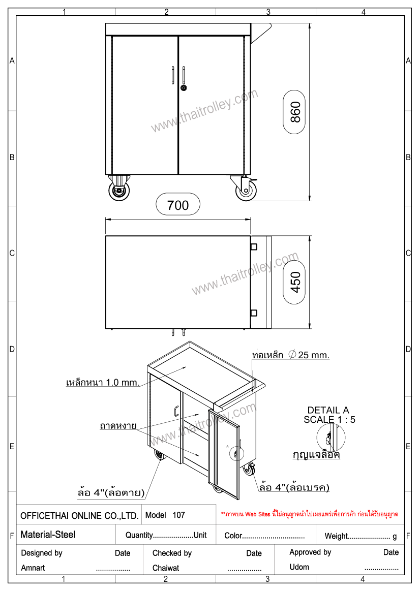 รถเข็นเครื่องมือ ขนาด 45 x 70 x 86 C.M. โครงสร้างเป็นเหล็กพ่นสี พร้อมประตู เปิด - ปิด มีขอบกันตก 5 C.M. ประกอบด้วยงานเชื่อม ทั้งคัน ขนาดล้อ 4 นิ้ว รับน้ำหนักได้ 250 ก.ก. เหล็กพ่นสีมีให้เลือก 5 สี พ่นด้วยสีฝุ่น (Powder Coating) อบด้วยอุณหภูมิ 180 องศาเซลเซียส |