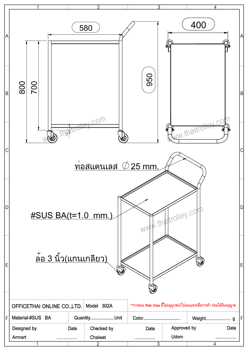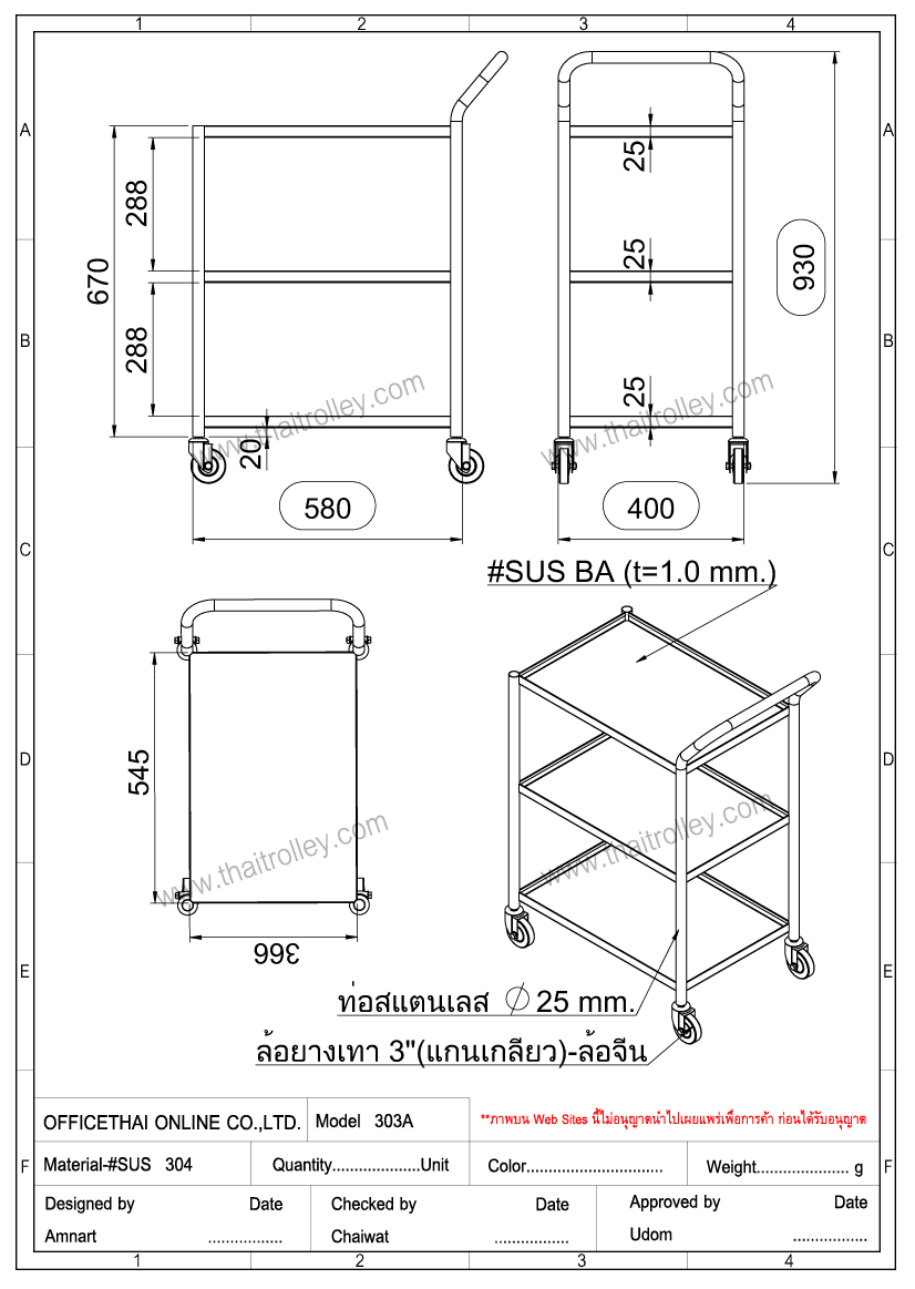 Model 302 A (แบบ 2 ชั้น) Model 303 A (แบบ 3 ชั้น) รถเข็นอเนกประสงค์ รถเข็นสแตนเลสขนาด 40 x 58 x 93 เซนติเมตร ถาดแต่ละชั้นทำด้วยสแตนเลสแบบเงา สวยงามมาก ทุกชั้นยกขอบกันตกทั้ง 4 ด้าน ด้านละ 2.5 เซนติเมตร ล้อยางสีเทาอย่างดี ขนาด 3 นิ้ว รับน้ำหนักได้ 150 กิโลกรัม รับงานหนักได้ีดีเยี่ยม มีให้เลือก 2 รุ่น แบบ 2 ชั้น และ 3 ชั้น ใช้สแตนเลสเกรด 304 ไม่ขึ้นสนิม |