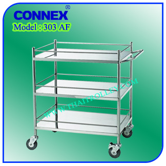 Model 303 AF รถเข็นแบบ 3 ชั้น มีราวกันตก ขนาด 36 X 54 X 93 เซนติเมตร (ความยาวไม่รวมแขนจับ) มีราวกันตก 4 ด้าน ทั้ง 3 ชั้น ราวแต่ละชั้นสูงห่างจากพื้น 6 เซนติเมตร ทำด้วยเพลาสแตนเลสขนาด 4.5 มิลลิเมตร ถาดแต่ละชั้นทำด้วยแผ่นสแตนเลสเงา (BA) สวยงามมาก โครงทำด้วยท่อกลมสแตนเลสขนาด 1 นิ้ว ทุกชั้นมีราวกันตกทั้ง 4 ด้าน ล้อยางสีเทาอย่างดี ขนาด 3 นิ้ว หมุนอิสระทั้ง 4 ล้อ รับน้ำหนักได้ 150 กิโลกรัม รับงานหนักได้ดีเยี่ยม ใช้สแตนเลสเกรด 304 ไม่ขึ้นสนิม |