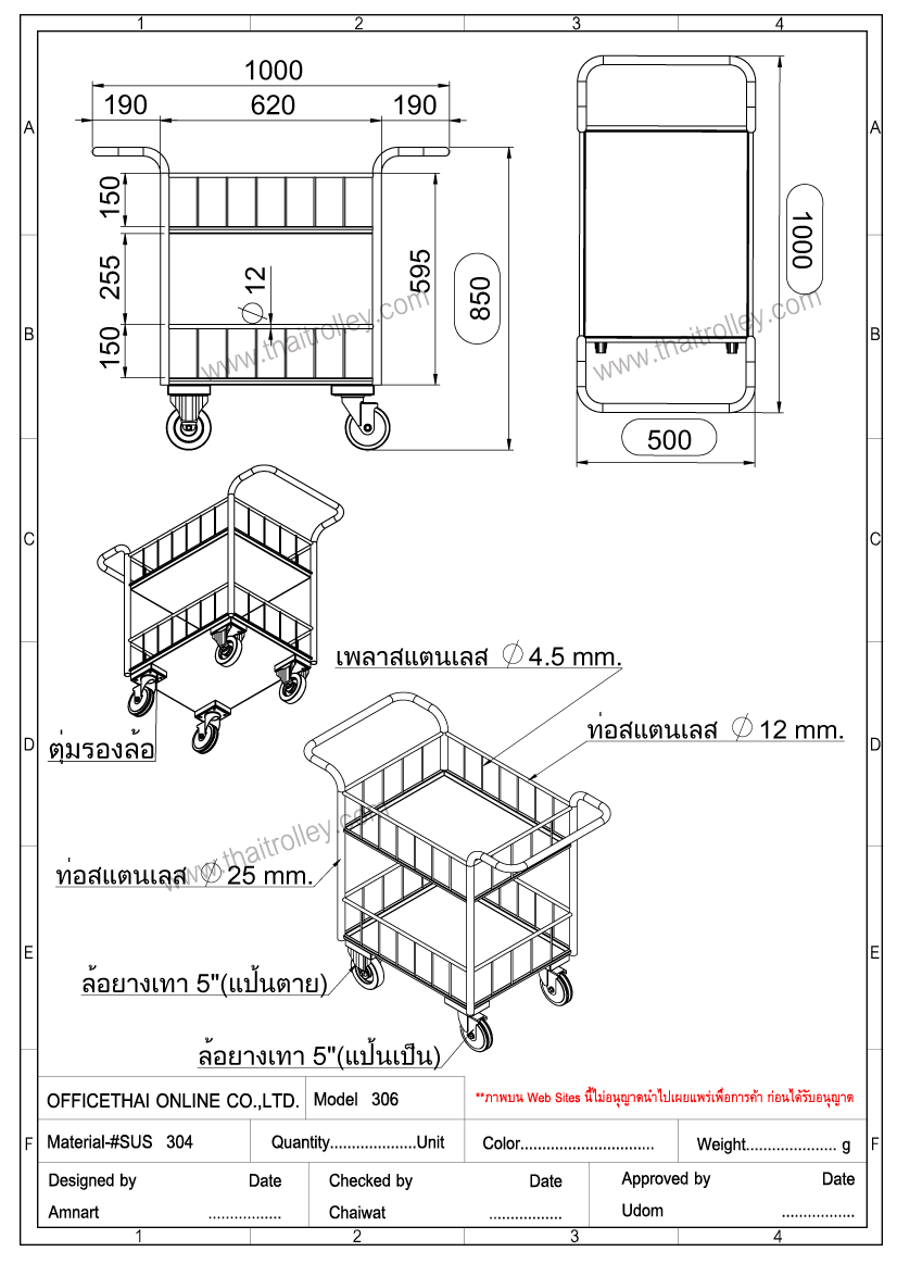 | รถเข็นอเนกประสงค์ ชนิดทำด้วยสแตนเลส เกรด 304 ขนาด 50 x 62 x 85 เซนติเมตร ( ก x ย x ส ) มีด้ามจับเข็นยืนออกมาข้างละ 10 เซนติเมตร แบบ 2 ชั้น มีขอบกันตก 15 เซนติเมตร ล้อเป็น ยางเทาขนาด 5 นิ้ว สวย แข็งแรงทน รับงานหนักได้ 250 กิโลกรัม |