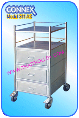 รถเข็นเอนกประสงค์ ขนาด 45 x 55 x 120 C.M. ชนิดทำด้วยสเตนเลสเกรด 304 แบบ 2 ชั้นวางของมีแนวกันตกทุกชั้น และ3 ลิ้นชักเก็บของ ขนาดล้อ 4 นิ้ว (อิสระ 4 ล้อ) ล้อ 2 ล้อหน้าล็อคได้ แบบใช้เท้ากด แข็งแรงด้วยงานเชื่อมทั้งคัน