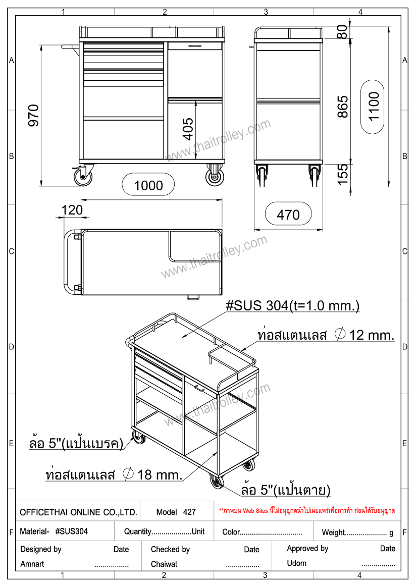 | รถเข็นเตรียมอาหาร ขนาด 47 X 100 X 110 ซ.ม. ชนิดทำด้วยแสตนเลส ขึ้นรูปสวยงามอย่างมีสัดส่วน แข็งแรง โครงสร้างเป็นแสตนเลสเกรด 304 ทั้งหมด มีลิ้นชัก เก็บของ 3 ชั้น ชั้นวางของ 2 ชั้น 2 ด้าน(ตามแบบ) ขนาดล้อ 5 นิ้ว ล็อคได้ 2 ล้อ สวยงามแข็งแรงทนทานรับงานหนัก รับน้ำหนักได้ 300 ก.ก. |