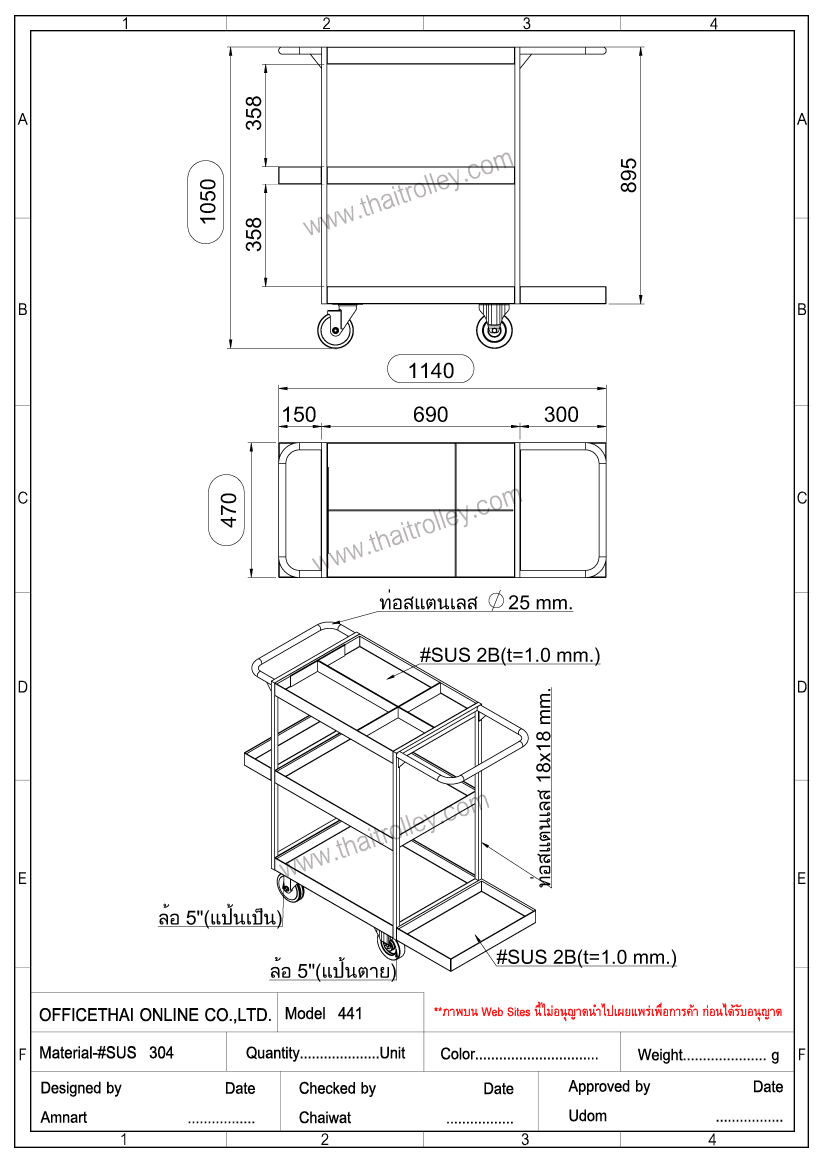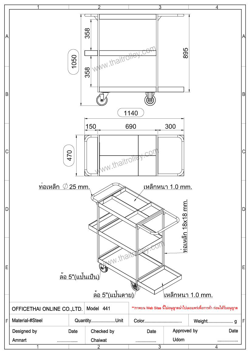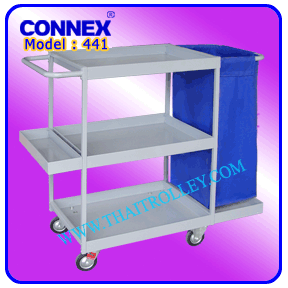รถเข็นแม่บ้าน ขนาด 47 x 114 x 105 C.M. แบบ 3 ชั้น ขอบกันตก 6 C.M. ถุงบรรจุสิ่งของ 1 ถุง ขนาดล้อ 5 นิ้ว โครงสร้างแข็งแรง รองรับงานหนักได้ ด้วยงานเชื่อมติดกันทั้งคัน