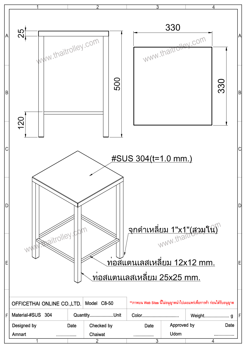 เก้าอี้ทรงเหลี่ยม ทำด้วยสแตนเลสเกรด 304 Top ขนาด 33 x 33 เซนติเมตร ขาทำด้วยสแตนเลสท่อกลมขนาด 1" x 1" (25 x 25 มิลลิเมตร) ความสูงรวม Top 50 เซนติเมตร ทำผิวแฮร์ไลน์ทั้งชิ้นงาน
