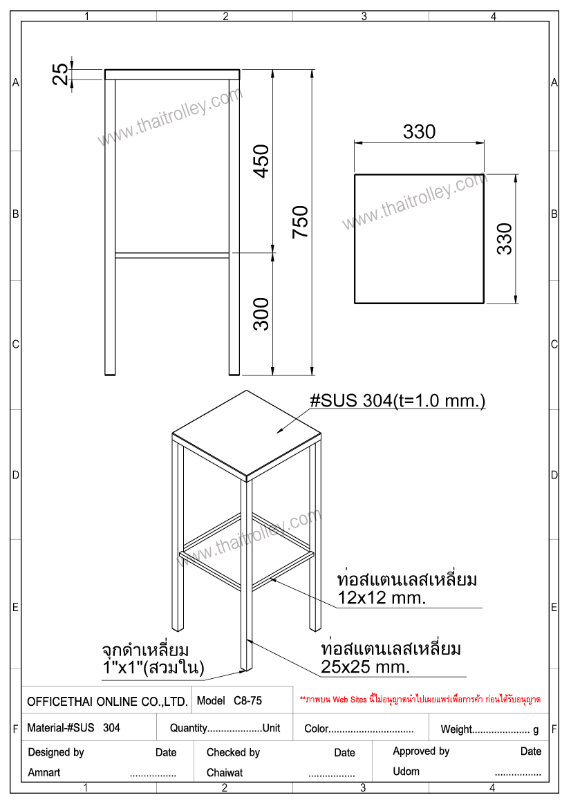 เก้าอี้ทรงเหลี่ยมสูง ทำด้วยสแตนเลสเกรด 304 Top ขนาด 33 x 33 เซนติเมตร ขาทำด้วยสแตนเลสท่อกลมขนาด 1" x 1" (25 x 25 มิลลิเมตร) ความสูงรวม Top 75 เซนติเมตร ทำผิวแฮร์ไลน์ทั้งชิ้นงาน